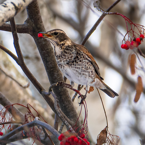 いろいろあって1週間ぶりの訪問となりましたが、ようやくツグミの姿をとらえることができました。今シーズンこれまでは10月に一度、上空を飛ぶのを見ただけでした。ドームと農業研究センターとを行き来しながら、写真のようにナナカマドの実をつついていました。